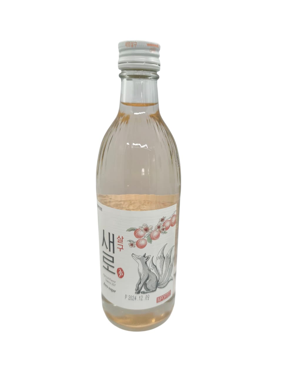 Soju coreano sabor damasco, con un perfil dulce y aromático, presentado en una botella ilustrada de estilo tradicional.