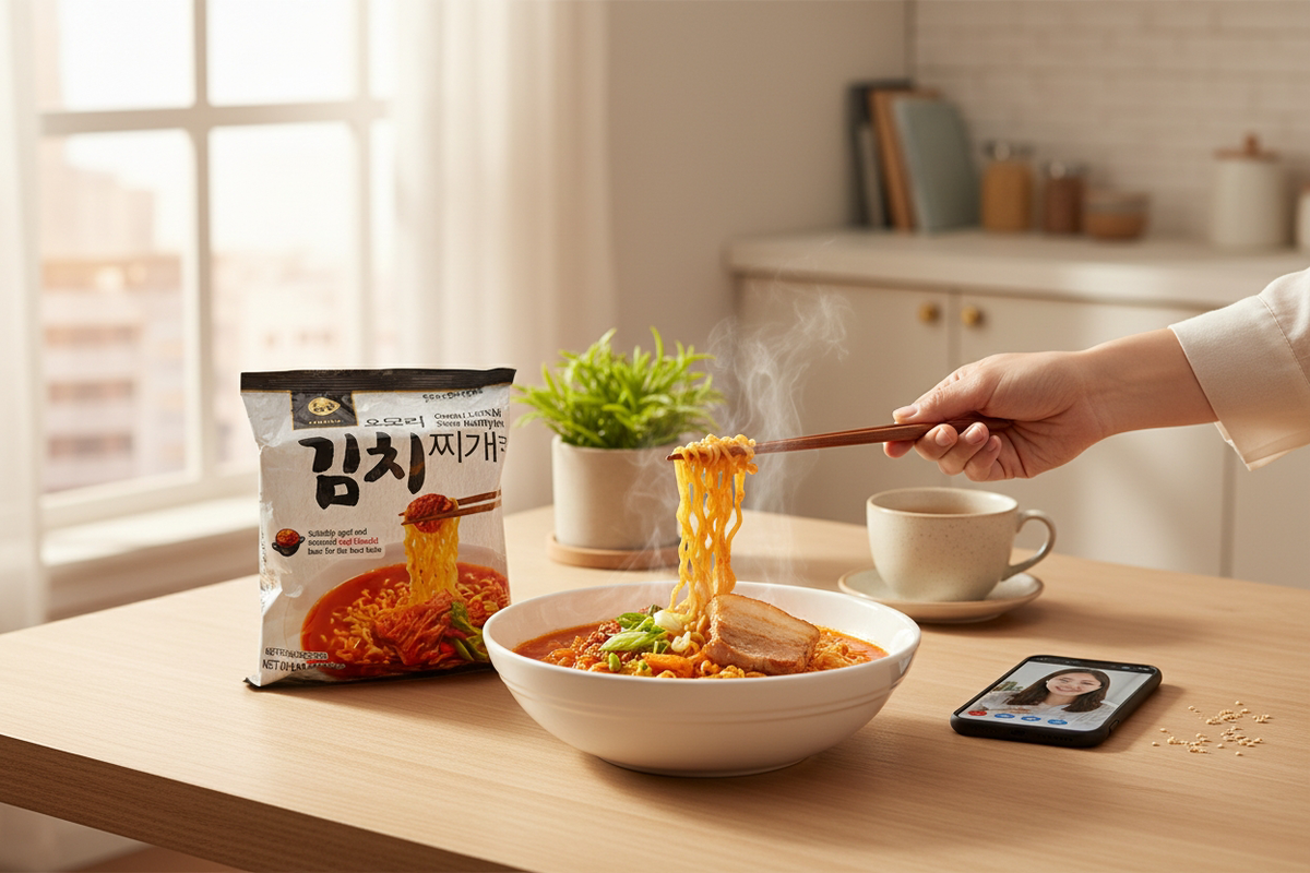 El Omori Kimchi Stew Ramyun es un ramen coreano premium inspirado en uno de los platos más emblemáticos de Corea del Sur: el Kimchi Jjigae.